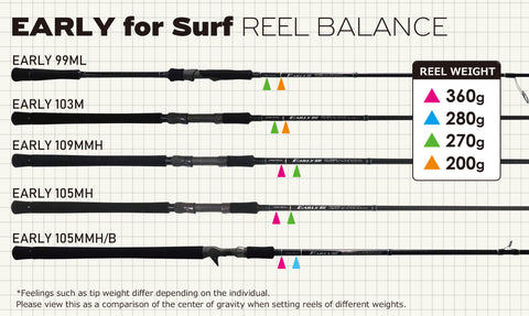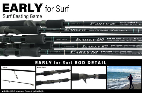explore vast surf areas and catch big fish. The 10ft9in length produces a bat power specialized for long-distance casting of plugs, and the blanks combine a delicate tip that can also be used with sea bass plugs of about 8g to realize delicate game development at long distances. Although it is long, it has excellent operability and sensitivity, and it does not miss changes in tidal pressure during night surf games, making it ideal for games where you need to decipher rip currents and topographical changes. It can handle plugs weighing around 45g without stress, so it is recommended not only for maru perch and blackfin sea bass games at Gorota Beach and Hiraiso, but also for sea cherry games.